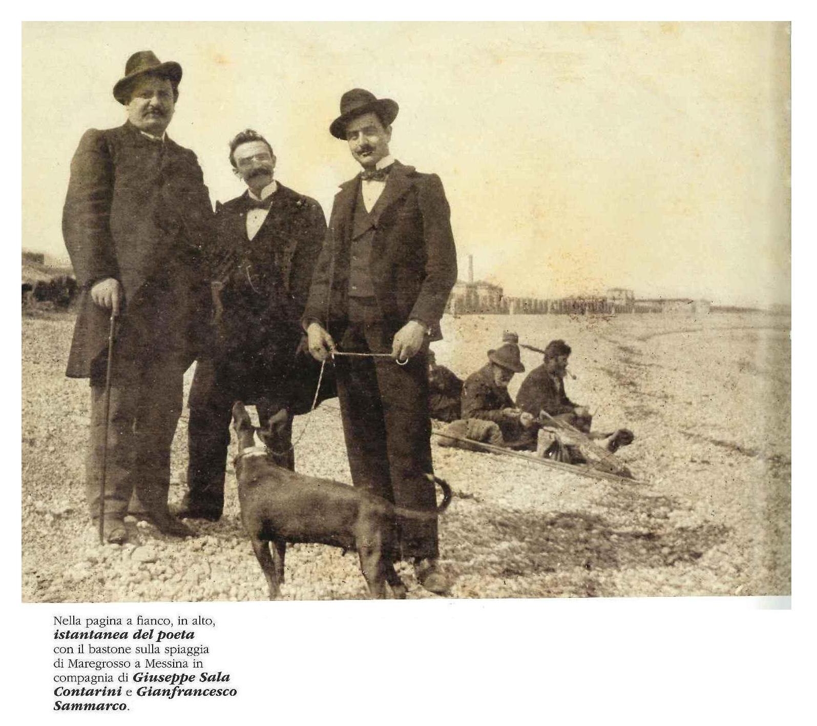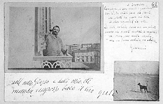 Cartolina-collage con fotografie scattate e sviluppate dal poeta. Pascoli è al balcone della casa di Messina che abiterà fra il 1897 e il 1903; in basso il cane Gulì sulla spiaggia messinese. I versi sono inviati a Severino Ferrari